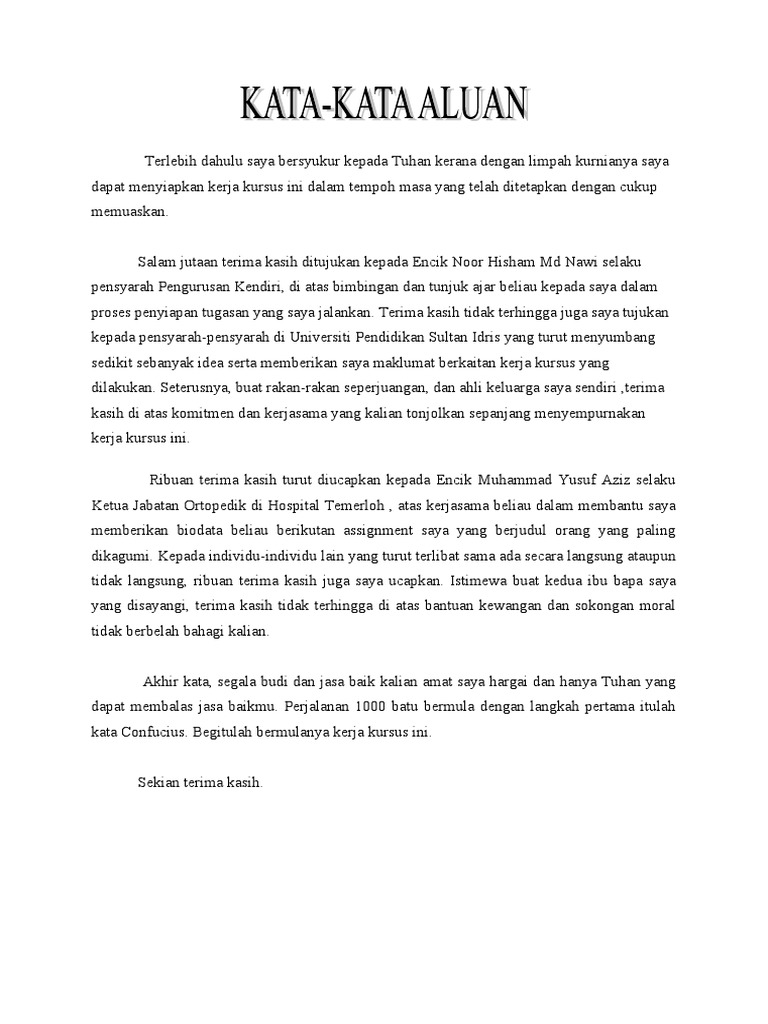 Ucapan Alu Aluan Majlis Sekolah Ucapanku. KATA-KATA ALUAN ﻪﺗﺎﻛﺮﺑﻭ ﷲ ﺔﻤﺣﺭﻭ ﻢﻜﻴﻠﻋ ﻡﻼﺴﻟﺍ Terlebih dahulu saya mengucapkan syukur kepada Allah SWT kerana dengan limpah rahmat-Nya JAKIM dapat menerbitkan Buku Garis Panduan KAFA. Contoh Kata Pengantar Buku Kata pengantar adalah sebuah kalimat pembuka dari penulis atau penyusunnya terkait karya tulis ilmiah yang ingin dibuatnya.